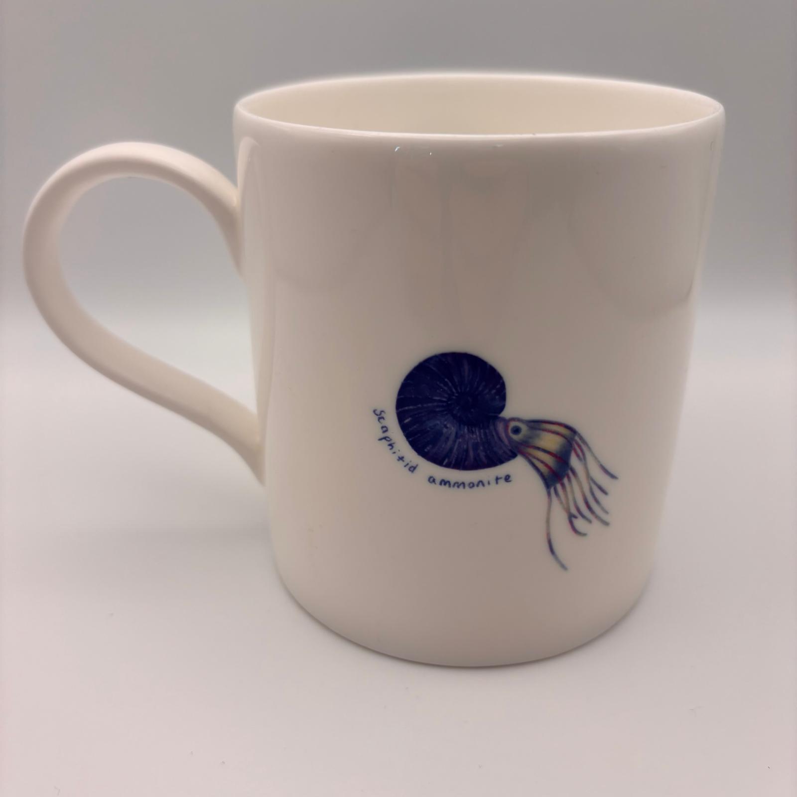 A Lyme Regis Museum exclusive bone china mug, featuring a beautiful ammonite design by the Cookieraptor.