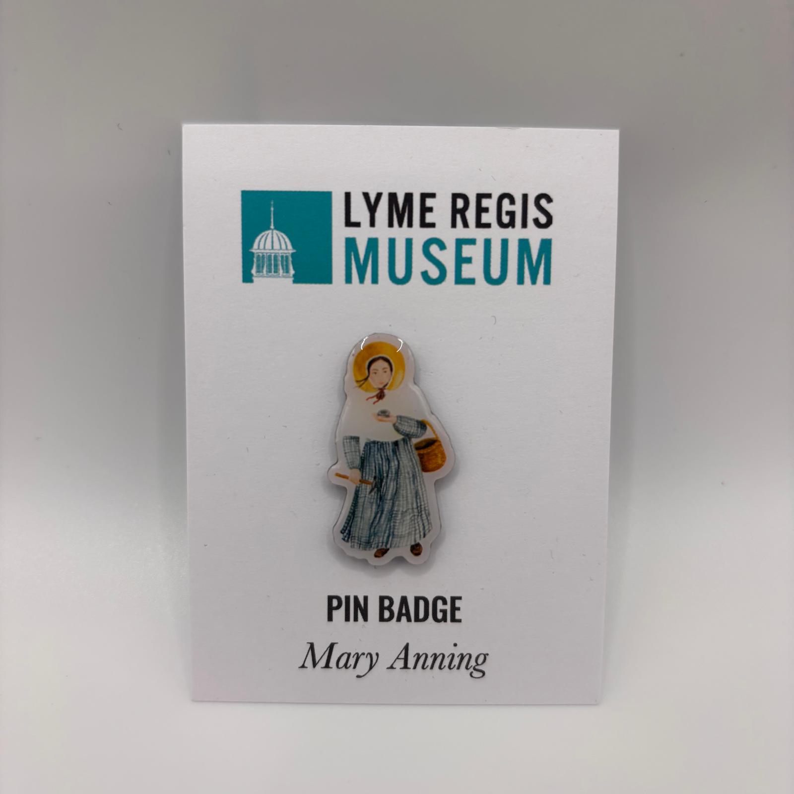 A Lyme Regis Museum exclusive, Mary Anning pin badge from an illustration by Artist Delphine Jones (22mm).