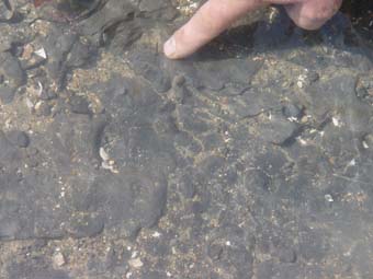This is a picture of an ichthyosaur skull collected Sept 21st 2008 by Peter Quellin Taylor from the beach at Seatown. The photo has a 2p coin in to indicate scale. The skull has been seen by members of the natural history museum staff during the Lyme regis Fossil Festival and they found it very interesting. Historically most ichthyosaurs were collected from the blue lias and shales with beef either side of Lyme Regis or from the Black Ven Marls. It is only comparatively recently that specimens have been collected from higher in the succesion at Seatown. This recent collecting has produced several interesting specimens including new species. Staff at the NHM thought this skull had an unusually small eye for its size and that it would stand further research into whether or not ii is from a new species.